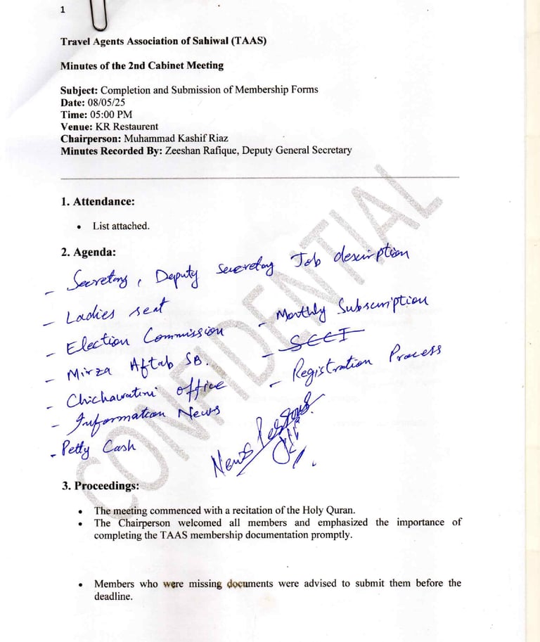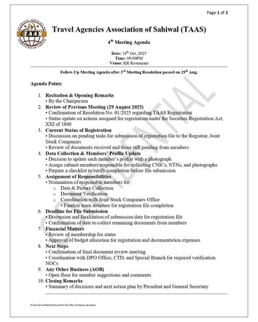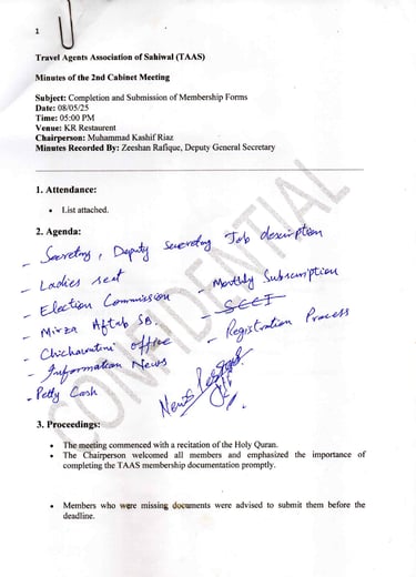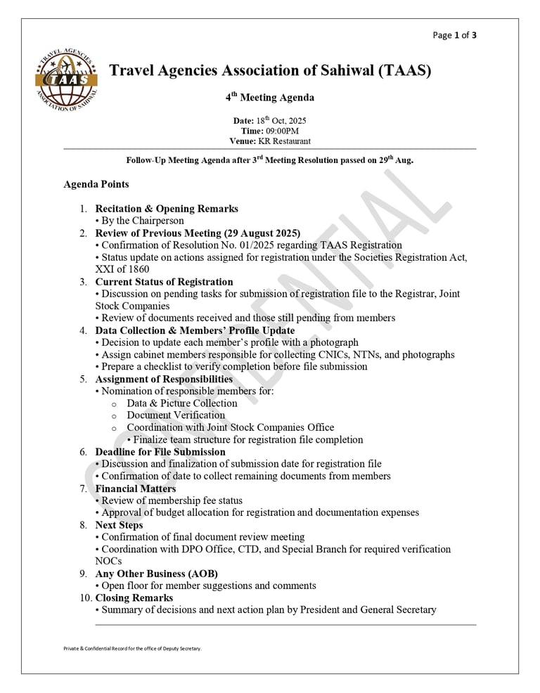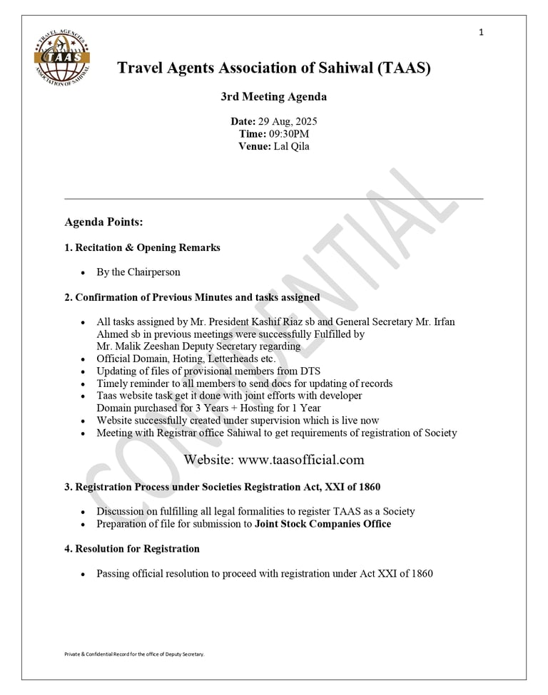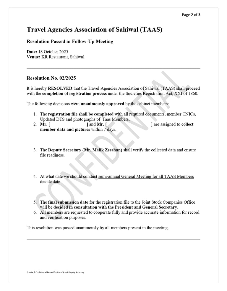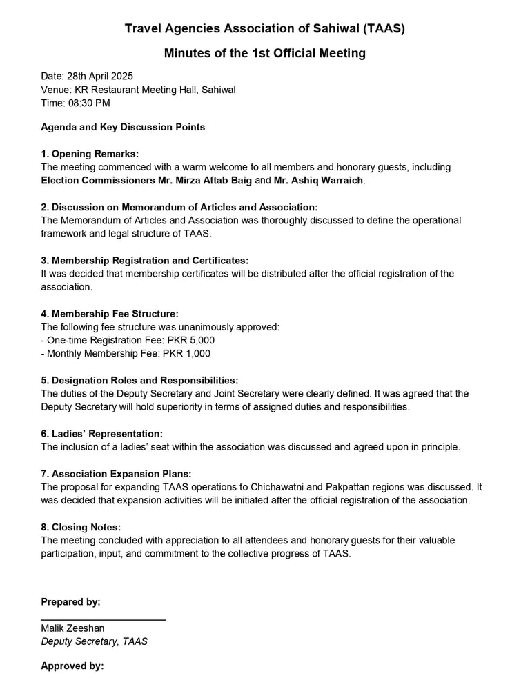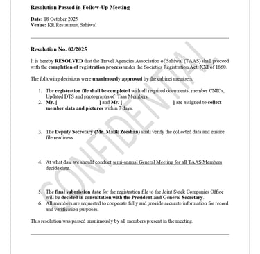 Resolution to Register TAAS as Travel Agencies Association of Sahiwal has passed and key decisions made in this meeting.